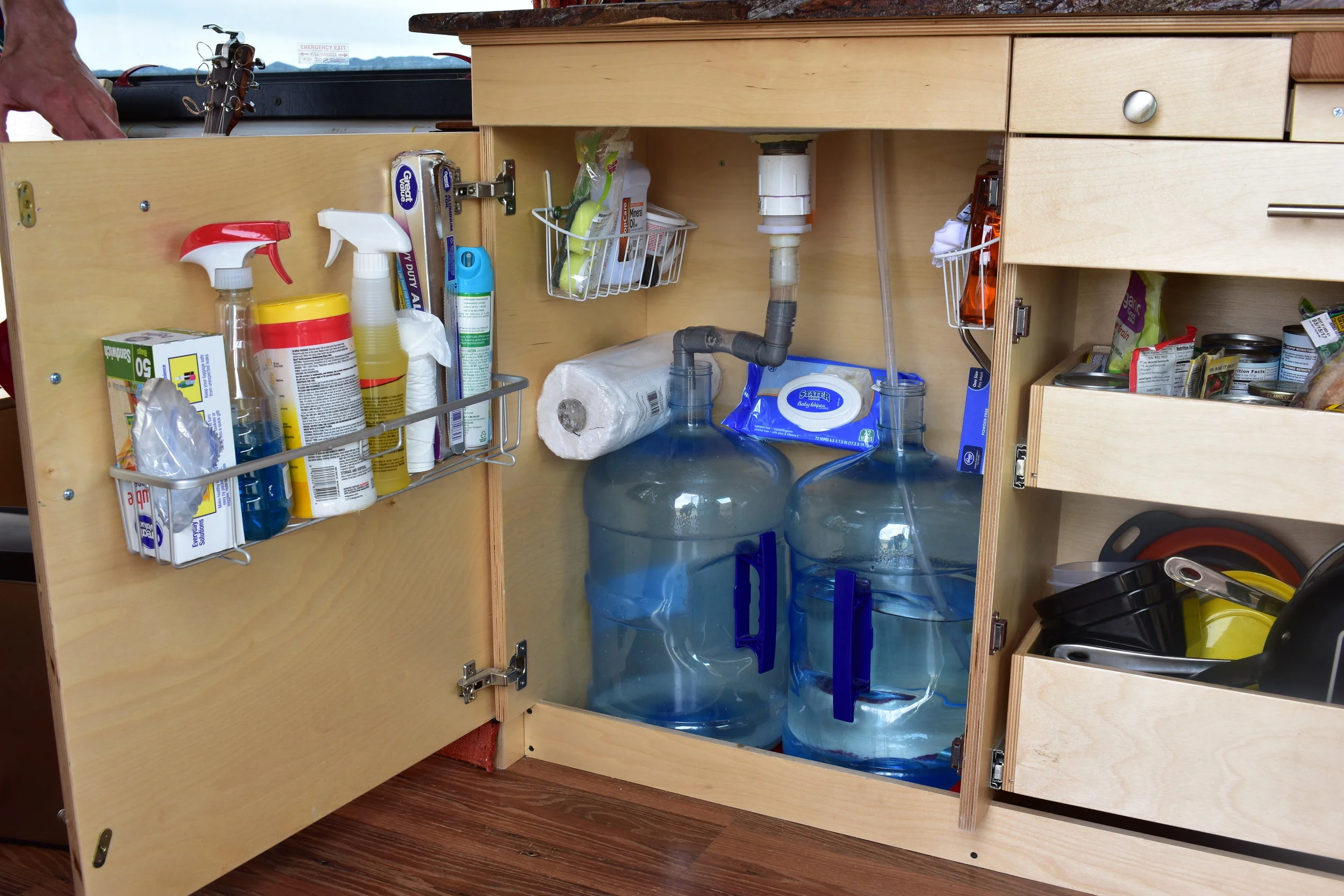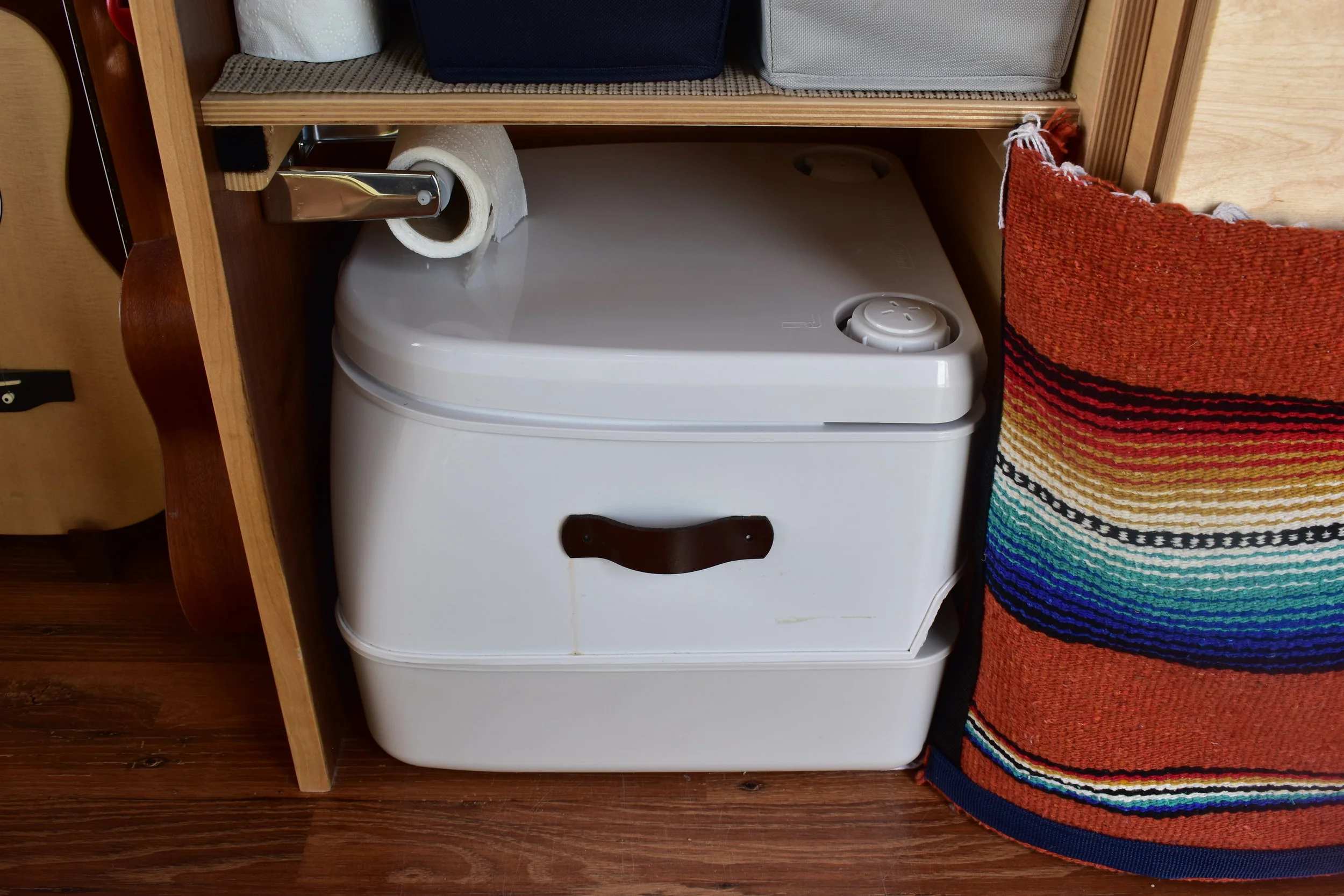 Our water system consists of two 5 gallon water jugs and a hand pump, and we quickly adapted to our new water-conscious lifestyle. We have a small 2.6 gallon chemical toilet, in which only #1 is allowed. Even with the caveat regarding numero dos, not having running water hasn’t really affected our lives at all!